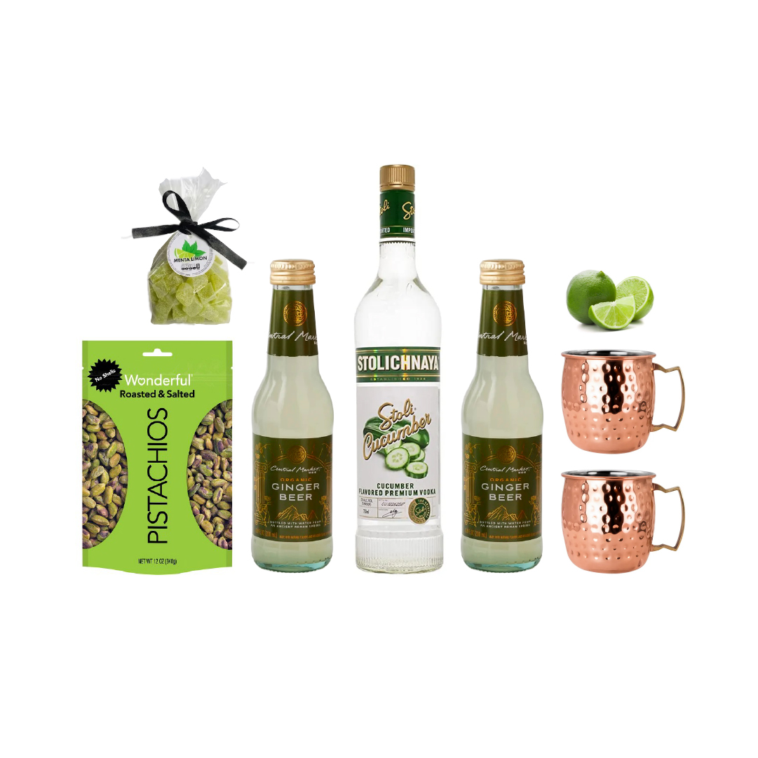 Un regalo Curado y refrescante. Contiene el sofisticado Vodka Stolichnaya Cucumber Premium, y Agua Tónica de Jengibre Ginger Beer Organic. Se complementa con 2 Tazas Moscow Mule de Cobre, Pistaches Wonderful, Gomitas Menta Limón y Limones. Un regalo Exclusivo para crear cócteles perfectos.