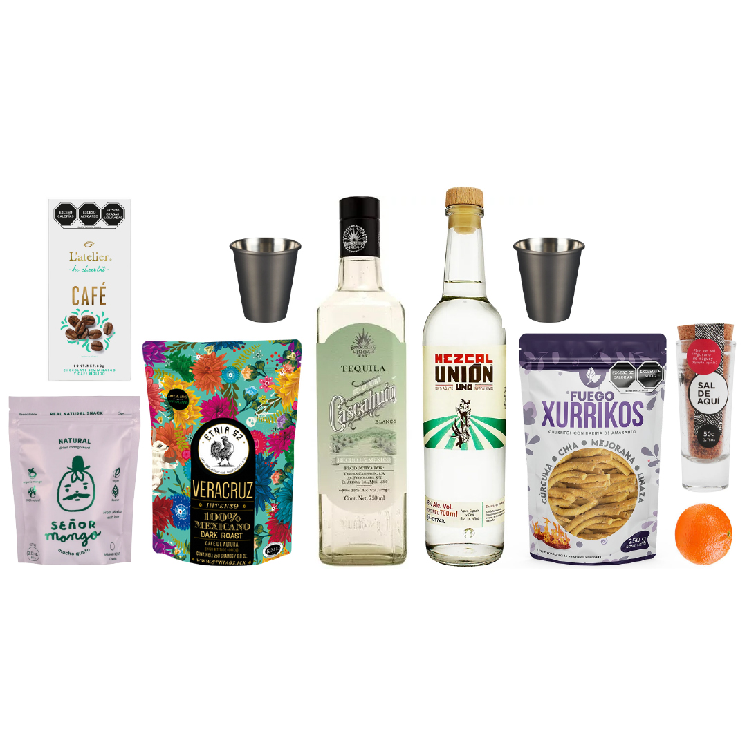 Nuestra pieza más Exclusiva y un tributo a la tradición y el sabor nacional. Presenta Tequila Blanco Cascahuin y Mezcal Unión. Se complementa con Café en Grano Etnia 52, Chocolate Belga con Café L’Atelier, Mango Kent Deshidratado y la esencial Sal de Aquí Sal de Gusano. Incluye Set de 4 Tequileros Kikkerland.